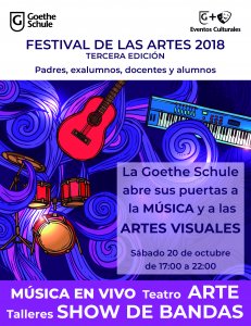 El 20 de octubre se realizará el III Festival de las artes. Contaremos con la participación de todos los grupos y talleres musicales del colegio, así como cantantes, bailarines, bandas instrumentales, grupos orquestales, coros, solistas vocales, profesionales y amateurs.
