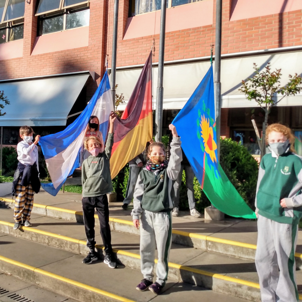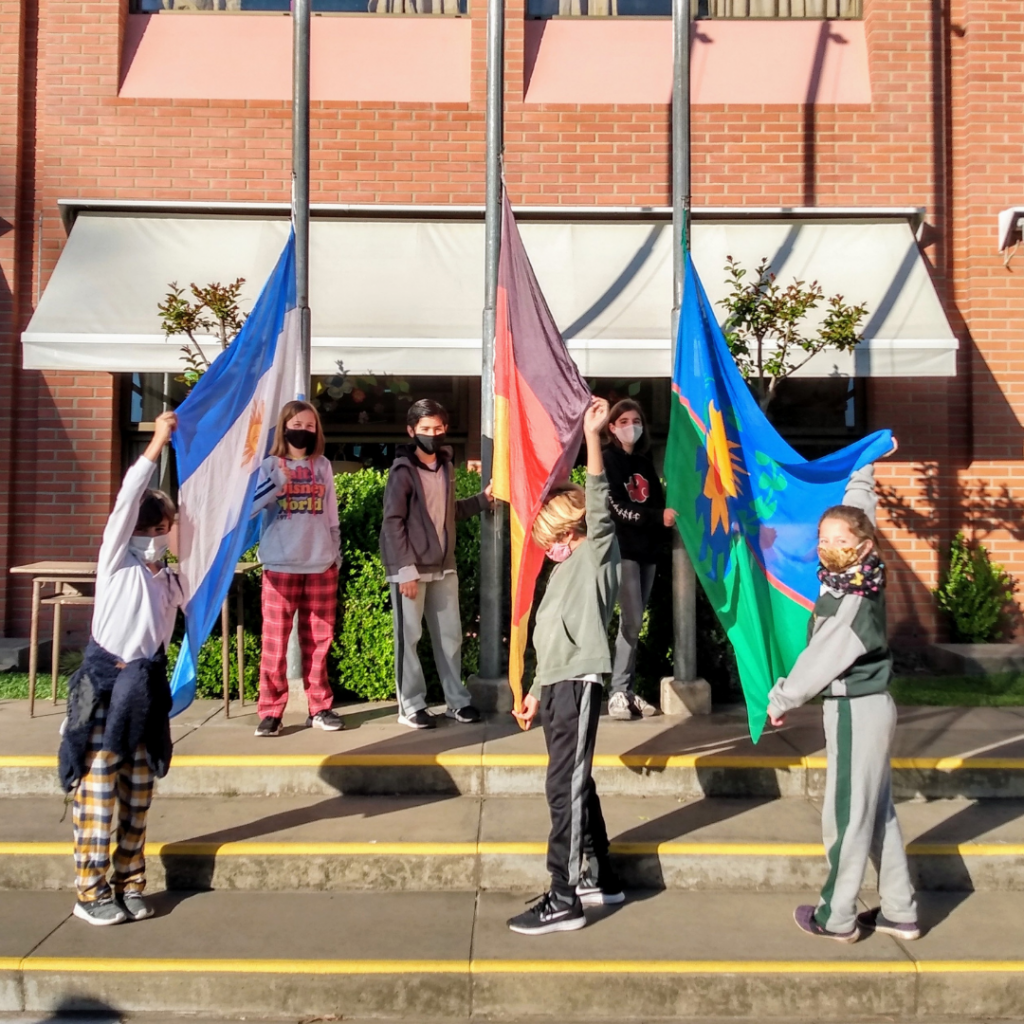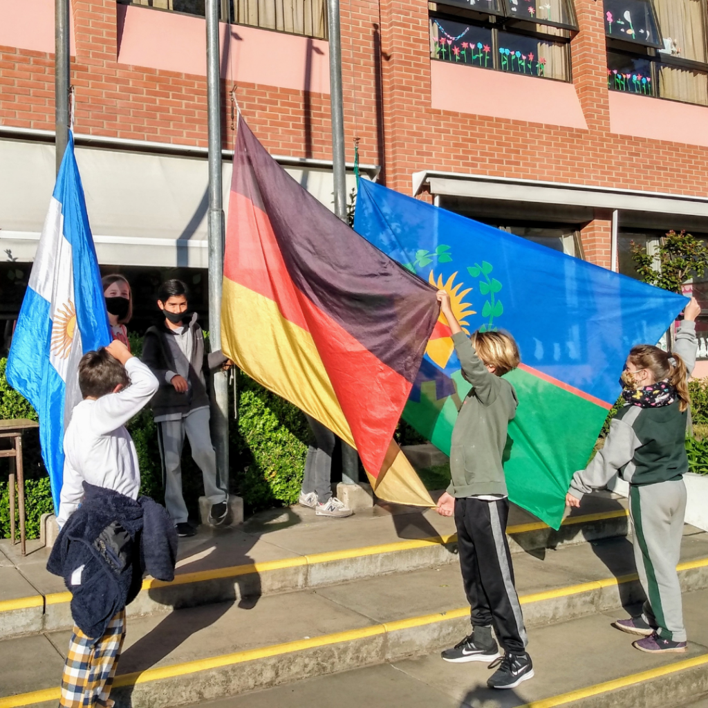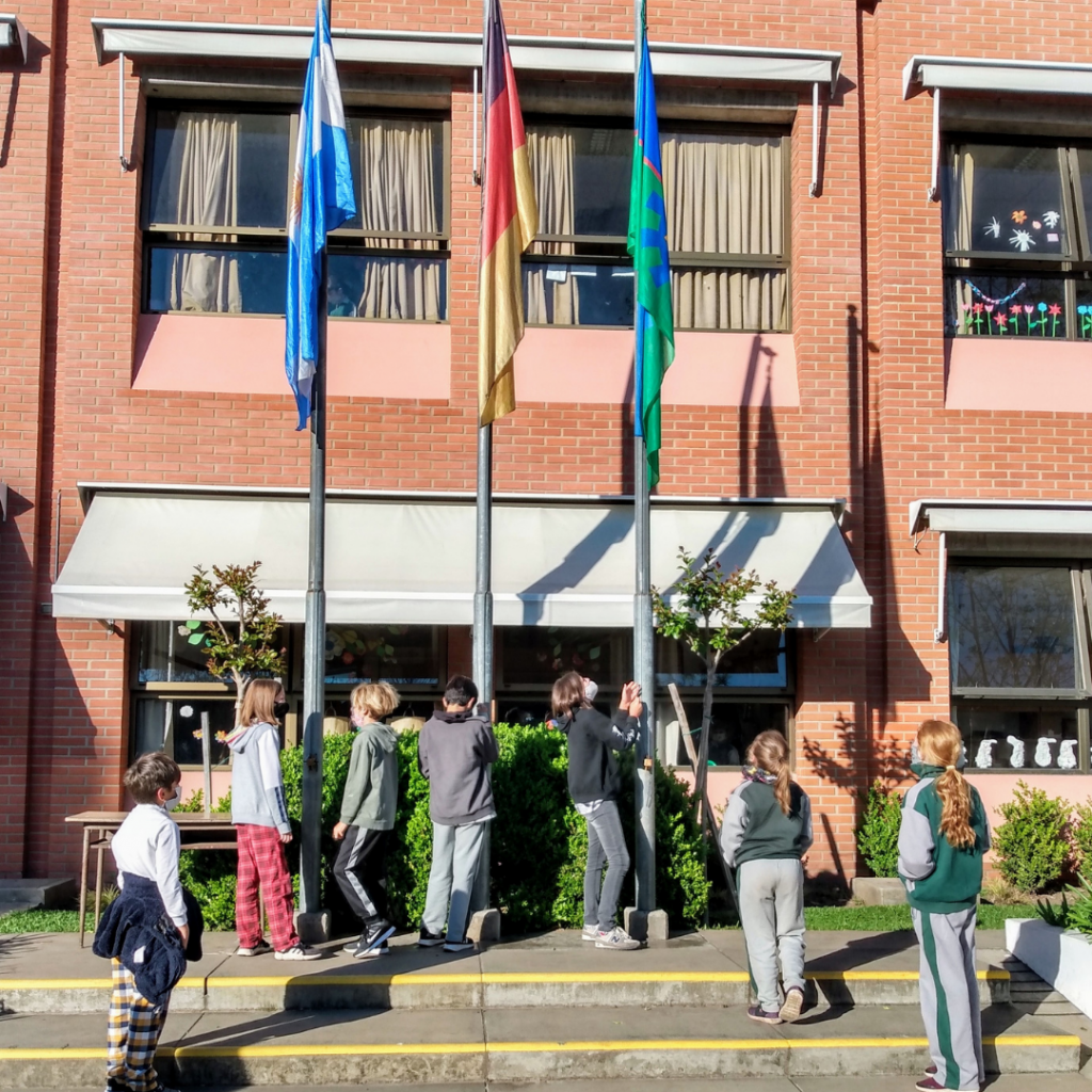 Junto a nuestros docentes izamos las tres banderas: la Bandera Nacional, la Bandera Alemana y la Bandera Bonaerense.