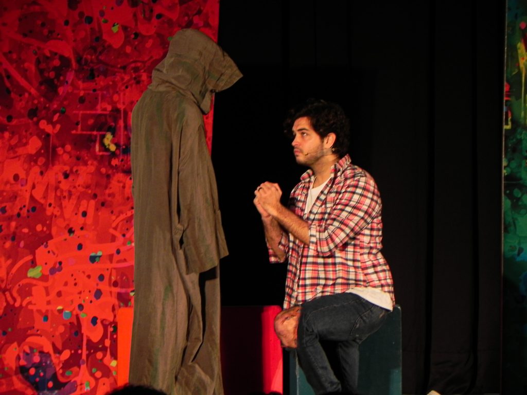 The cast consisted of five actors, three men and two women, each taking on one or two roles from the original story. For those unfamiliar with Romeo and Juliet or those watching the play without prior knowledge, the plot may have been difficult to follow, especially since the ending was slightly changed. On the positive side, the use of contemporary vocabulary, such as “thus” and “thy,” was inspired by Early Modern English, which added some authenticity to the dialogue. It’s worth mentioning that the actors’ costumes were quite creative, though slightly inspired by the original concept of Romeo and Juliet. Whereas the background was very simple and plain, the props used were very innovative. While traditional items like swords and daggers were featured, the letter Romeo writes to Juliet was modernized, not handwritten as in the original, but sent as an online message via smartphone.