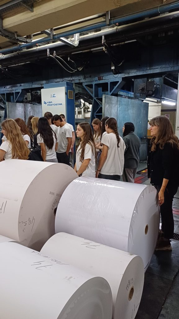 Luego de conversar frente a esas partes tan importantes de la historia mundial, Norma nos llevó a conocer la imprenta. Visitamos, escuchando a Oscar, uno de los operarios de las maquinarias utilizadas para imprimir los diarios Perfil, El Cronista, Página 12 y Tiempo Argentino, todo ese sector de trabajo editorial. Las máquinas, también traídas de Alemania en dos contenedores, son enormes y tienen estructuras y sistemas muy complejos para cada proceso, desde el transporte y el movimiento del papel, hasta el empaquetamiento de los diarios para su distribución a los canillitas y kioskos. Nos contaron también que se utilizan distintos tipos de papeles para imprimir, que la mayoría son importados desde Chile, Brasil, Estados Unidos y otros países puesto que en Argentina el único productor es Papel Prensa. Como cortesía, Oscar nos dejó llevarnos unos ejemplares de diarios y suplementos de juegos.