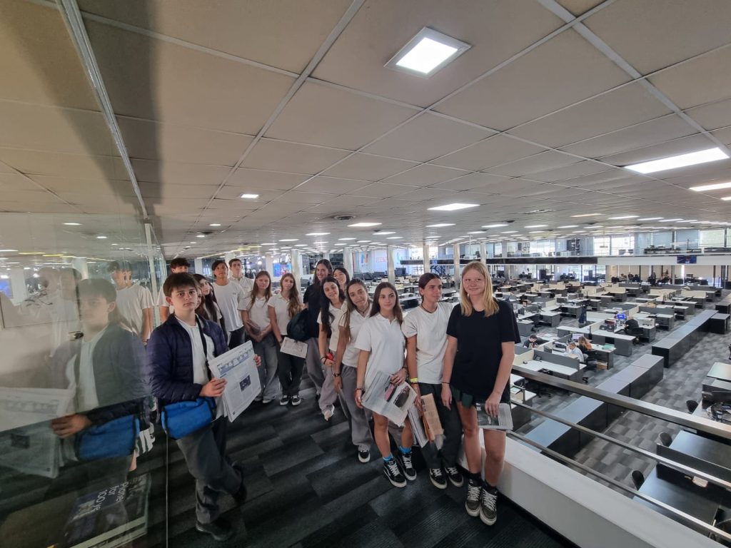 Luego de conocer la “Gran máquina de Oscar”, Norma nos llevó a recorrer los estudios de Tv y Radio. Lo primero que nos encontramos fue un espacio cuadrado gigante rodeado de oficinas y repleto de escritorios individuales o compartidos. Justo enfrente nuestro se estaba llevando a cabo en vivo el programa de televisión informativo acerca de economía del canal E, y seguimos el recorrido por las oficinas tratando de ser lo más silenciosos posibles para no interrumpir ni molestar a quienes estaban trabajando. Mientras dábamos la vuelta pasamos por detrás de la periodista que estaba hablando en vivo por este canal, y si se fijan en la grabación, nos van a poder ver pasando y saludando por el fondo. Fue un momento muy gracioso y divertido para nosotros. Todo estaba muy limpio y bien cuidado, las oficinas que rodeaban ese espacio estaban decoradas con arte de todo tipo y muy personalizadas de acuerdo a quién ocupase cada una. Al rodear el espacio pudimos ver en primer plano las estaciones de radio transmitiendo al aire, una de ellas era la reconocida “Gossip”. Nos fascinó ver de tan cerca el “detrás de cámaras” de las radios, canales de TV y procesos creativos de las oficinas que normalmente las vemos desde casa o directamente los resultados de sus producciones en diarios, pantallas, revistas o equipos de sonido.