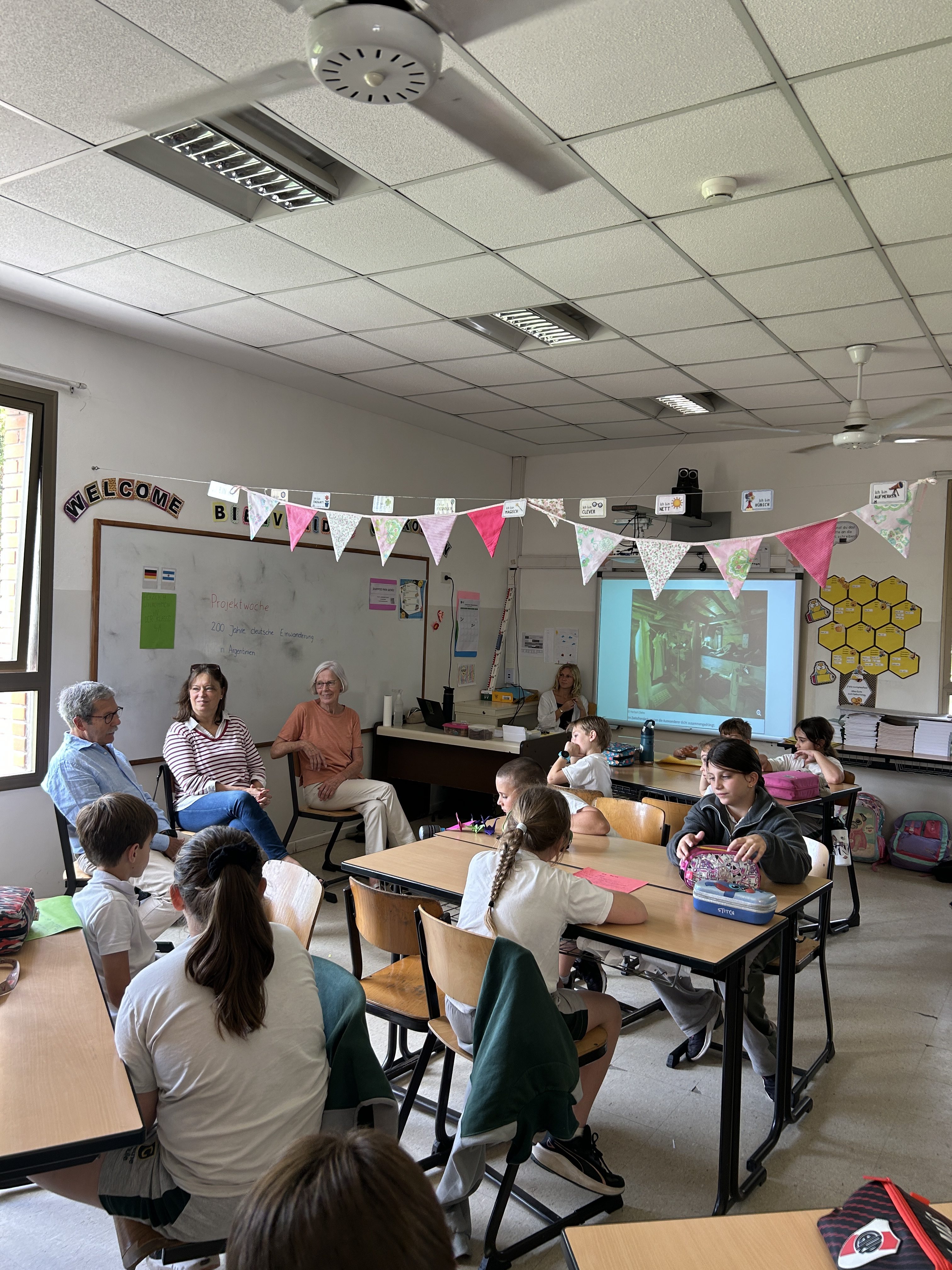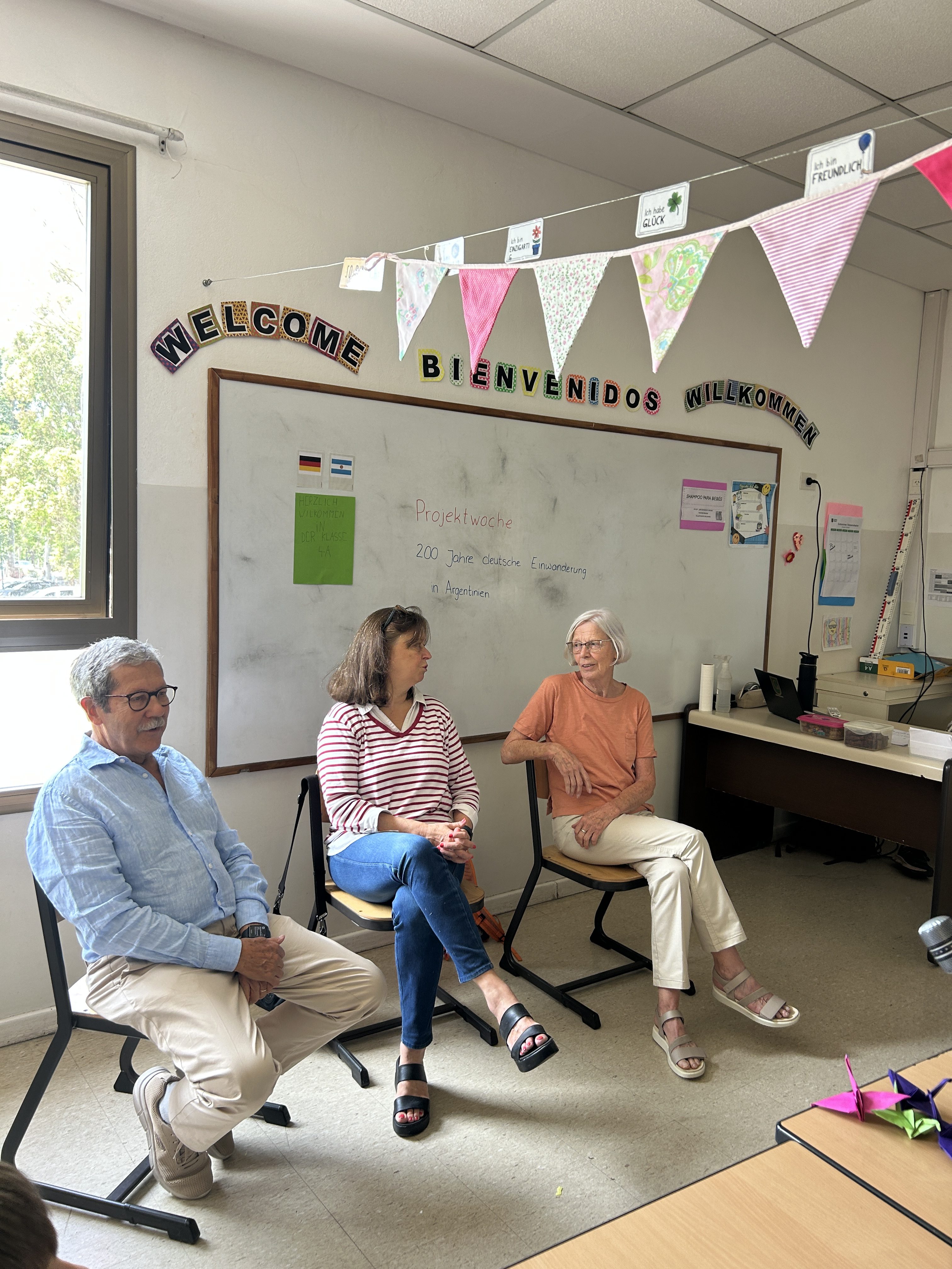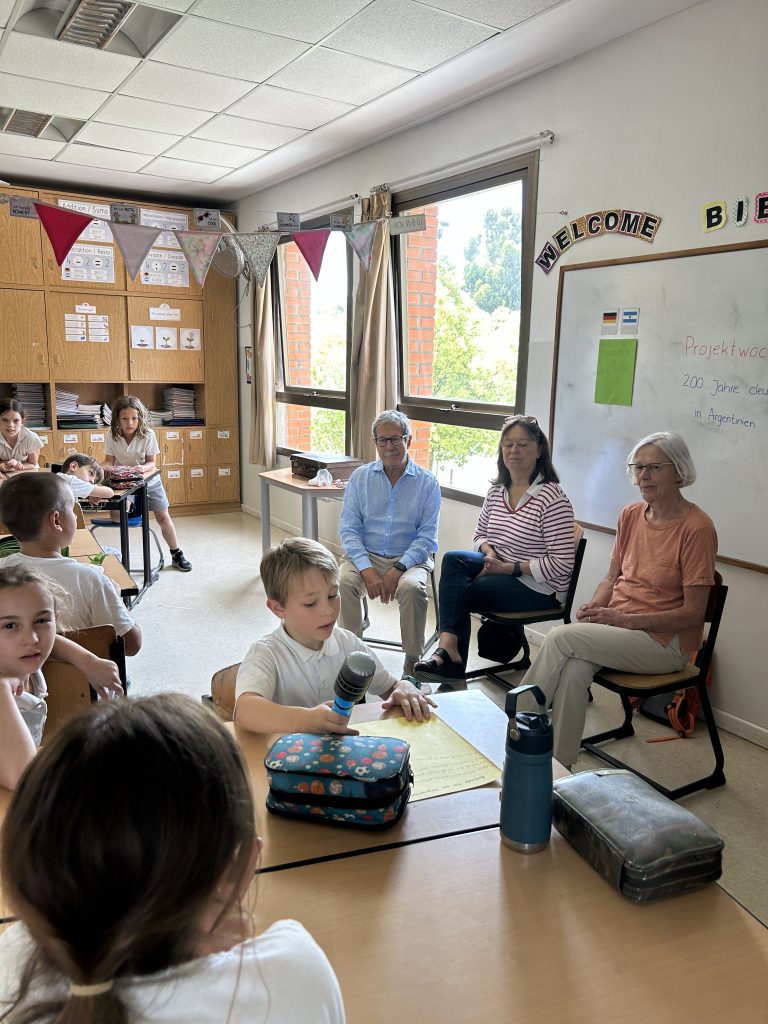 Un momento especialmente destacado fue la visita de dos abuelas y un abuelo de nuestra clase: Marianne, Birgit y Freddy. Todos ellos tienen una historia de inmigración muy personal y nos la contaron. Freddy nació en Argentina, su abuelo llegó aquí desde Alemania hace más de cien años. En realidad, solo quería adquirir experiencia en el extranjero durante unos años, pero entonces estalló la Primera Guerra Mundial y se quedó en Argentina. Marianne también nació en Argentina. Sus abuelos vinieron de Alemania en aquella época. Más tarde, ella misma se mudó a Alemania, pero al cabo de un tiempo regresó a Argentina. Birgit emigró de Alemania a Argentina a los 19 años por su espíritu aventurero. Quería vivir algo nuevo e incluso hizo sola el largo viaje en barco, ¡tres semanas! En su maleta llevaba ropa y una gran caja llena de libros. Birgit nos contó que, al llegar, estaba llena de ilusión.