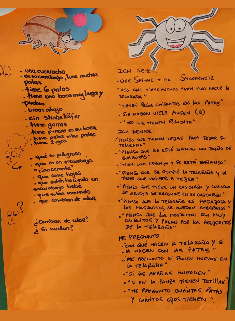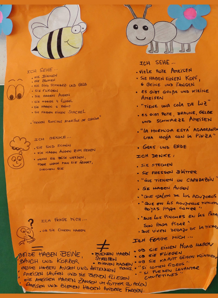 Um sich den Tieren zu nähern, wählten wir „Ich sehe, ich denke, ich frage mich“ und nachdem wir uns den Bienen und Ameisen genähert hatten, schlugen wir vor, eine weitere Übung „Vergleichen und Kontrastieren“ anzuwenden, um ihre Ähnlichkeiten und Unterschiede besser zu erkennen.