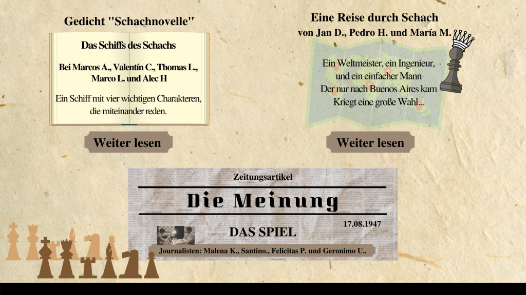 Die Schachnovelle von Stefan Zweig wurde von Schülern und Schülerinnen der 5. Klasse gelesen. Sie haben unterschiedliche Aufgaben wie Gedichte und einen Zeitungsartikel geschrieben, einen Trailer und ein Quiz so wie die Präsentation (und Begründung jener Textstelle) in einem Portfolio vorgestellt. Hier zeigen wir euch einige unserer Arbeiten.