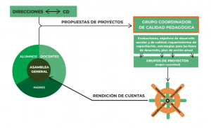 Die Steuergruppe verknüpft die verschiedene Bereiche der Schule für eine partizipative Schulentwicklung. Zu diesem Zweck nimmt sie Vorschläge aus der Schulgemeinschaft auf, bewertet sie, erarbeitet gemeinsame Ziele und setzt die Prozesse und Strategien zu deren Erreichung in Gang.